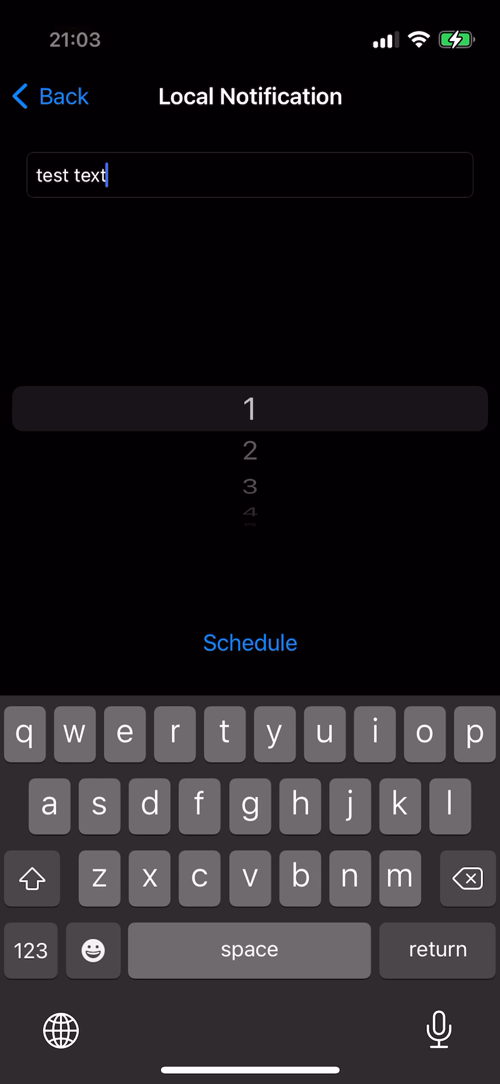 Text Field에 메시지를 입력하고, Picker View에서 시간을 선택한 다음 버튼을 누르면