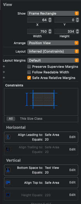 같은 방식으로 height 제약도 수정하고 Constraints를 All로 변경하고 확인해 보면,