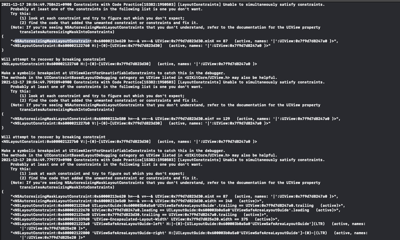 로그에는 NSAutoresizingMaskLayoutConstraint에 관한 에러들이 몇 개 보인다.