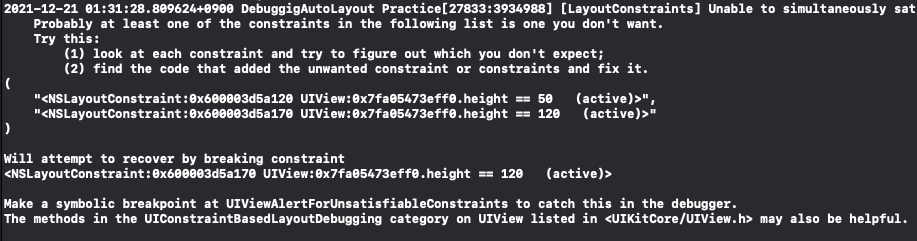 해당 문제는 이전 실습때 처럼 translateAutoresizingMaskIntoConstraint 속성을 비활성화하지 않은 문제다.