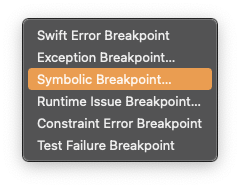 하단의 '+'버튼을 선택하고, Symbolic Breakpoint를 눌러