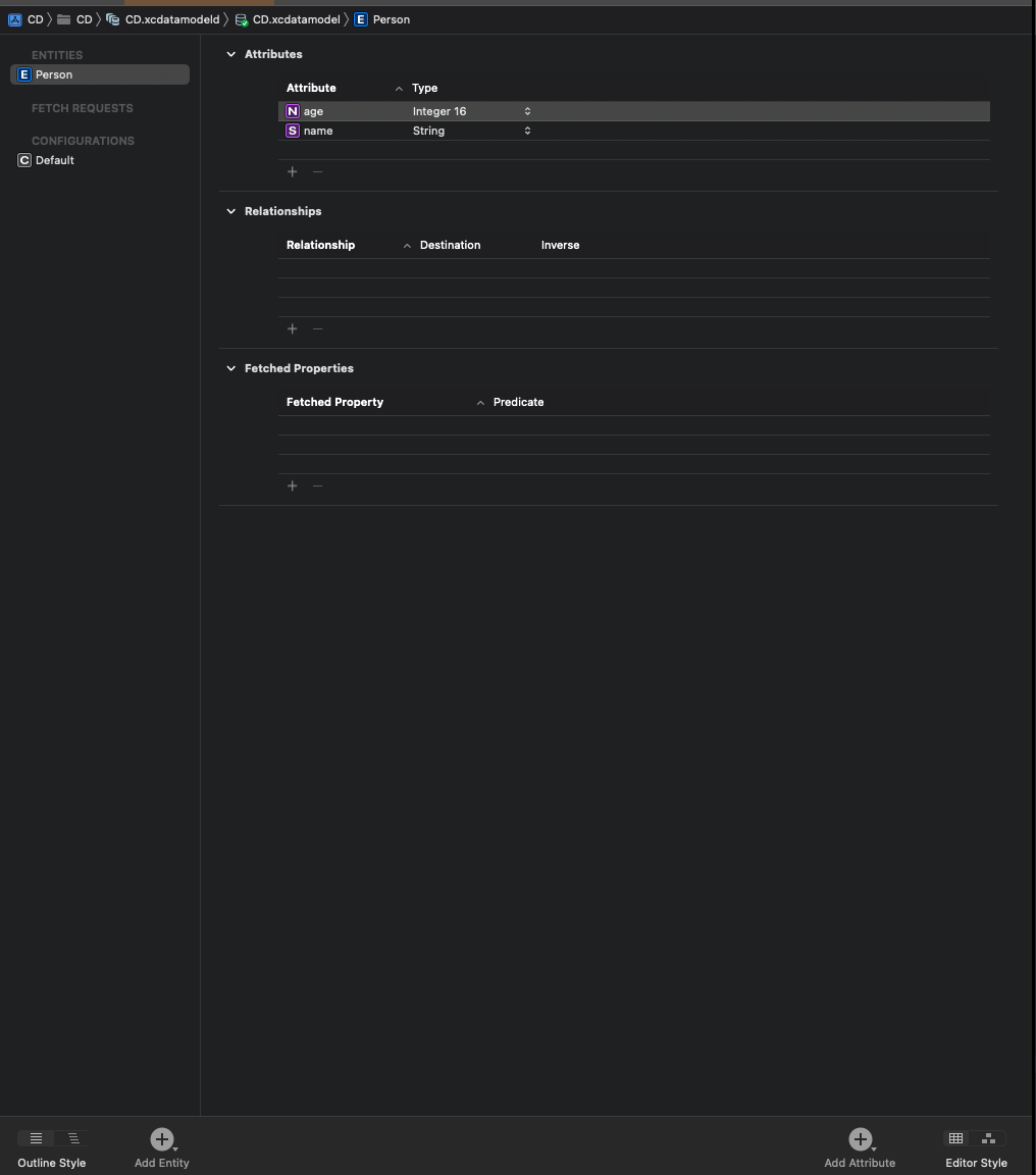 간단하게는 위의 두 가지 요소의 생성만으로 Core Data Model을 구성한다.