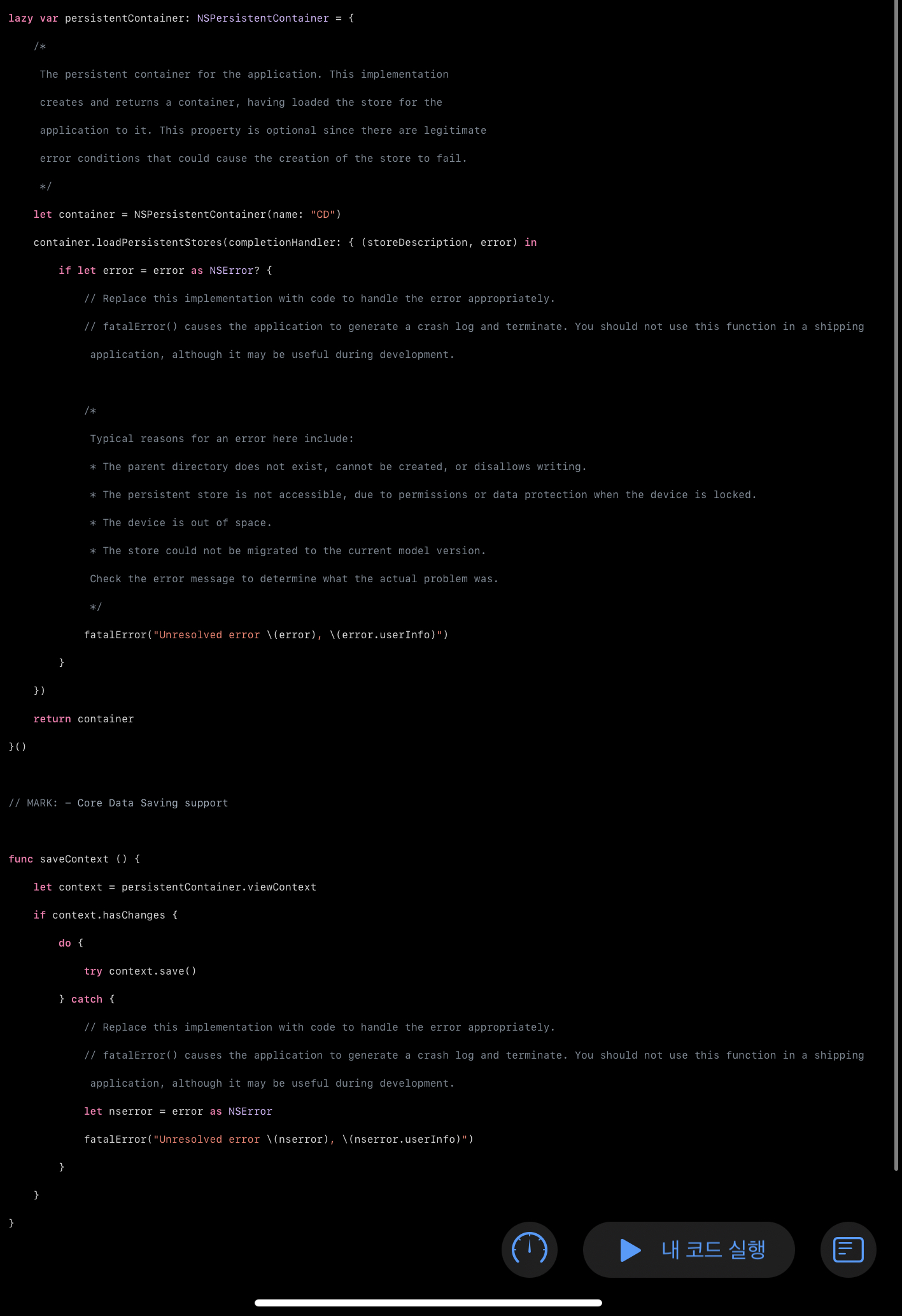 AppDelegate.swift 파일 내의 persistentContainer와 saveContext 메서드가 이에 해당한다.