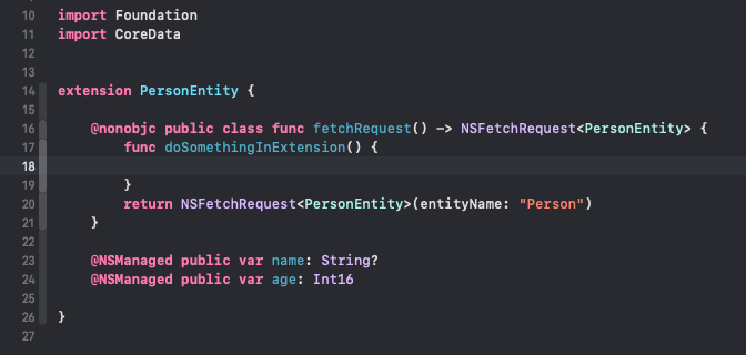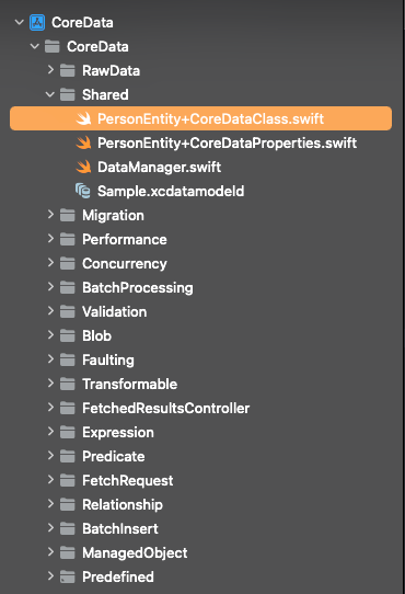 마지막 사진 같이 PersonEntity+CoreDataClass 파일과 PersonEntity+CoreDataProperties 파일 두개가 생성된다.