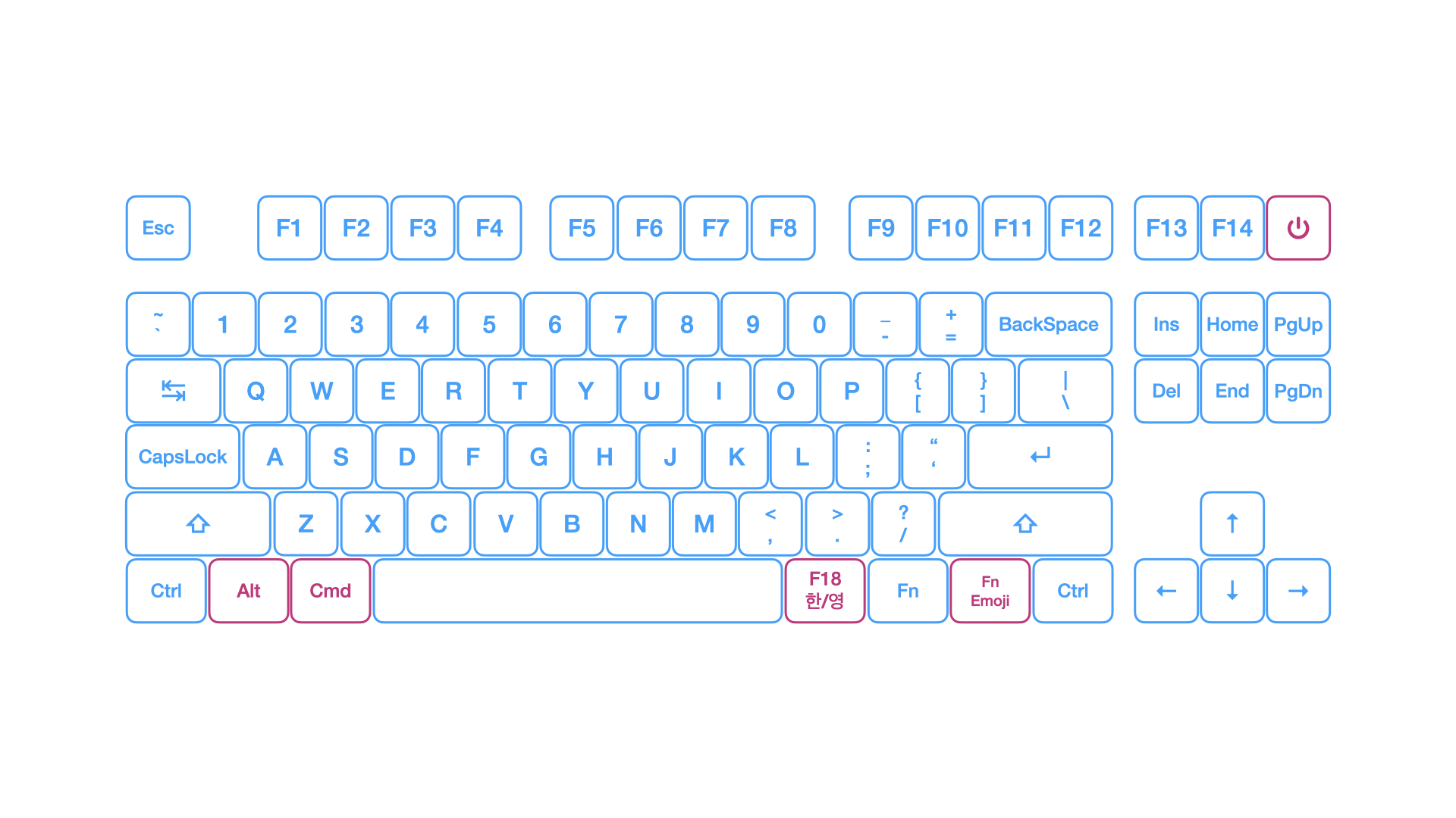 다시 맥 키보드의 레이아웃을 확인해 보면 Ins키 자리에 Fn 키가 존재하는 것을 확인할 수 있다.