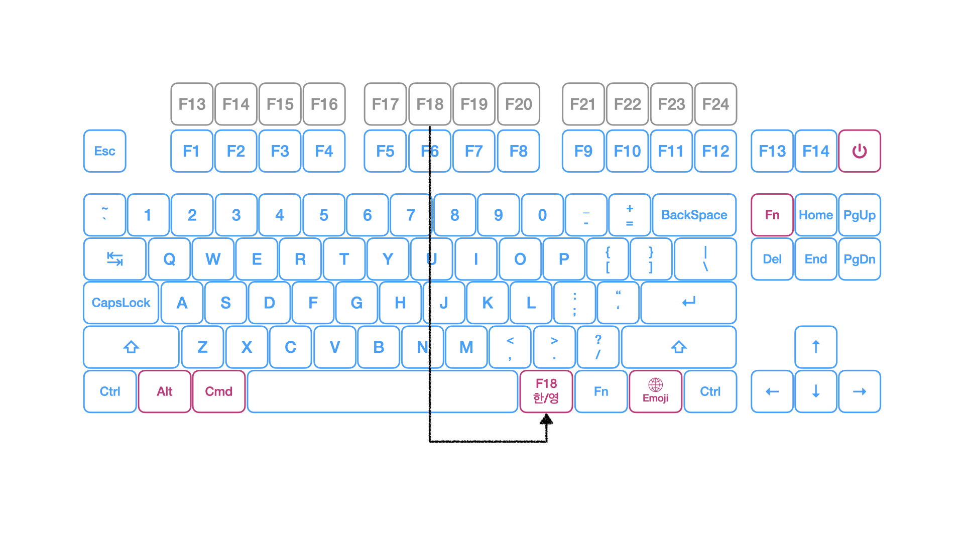 따라서 일반 키보드와 비교해 우린 있는지도 모르고 살거나 잊고 살던 F13 ~ F24까지 12개의 여유 키가 존재한다.