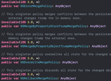 기본 값으로 충돌 시 오류를 발생하고, 저장을 진행하지 않는다. - NSMergeByPropertyStoreTrumpMergePolicy