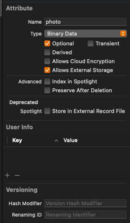 속성은 Binary Data, Optional, Allows External Storage를 사용하도록 설정한다.