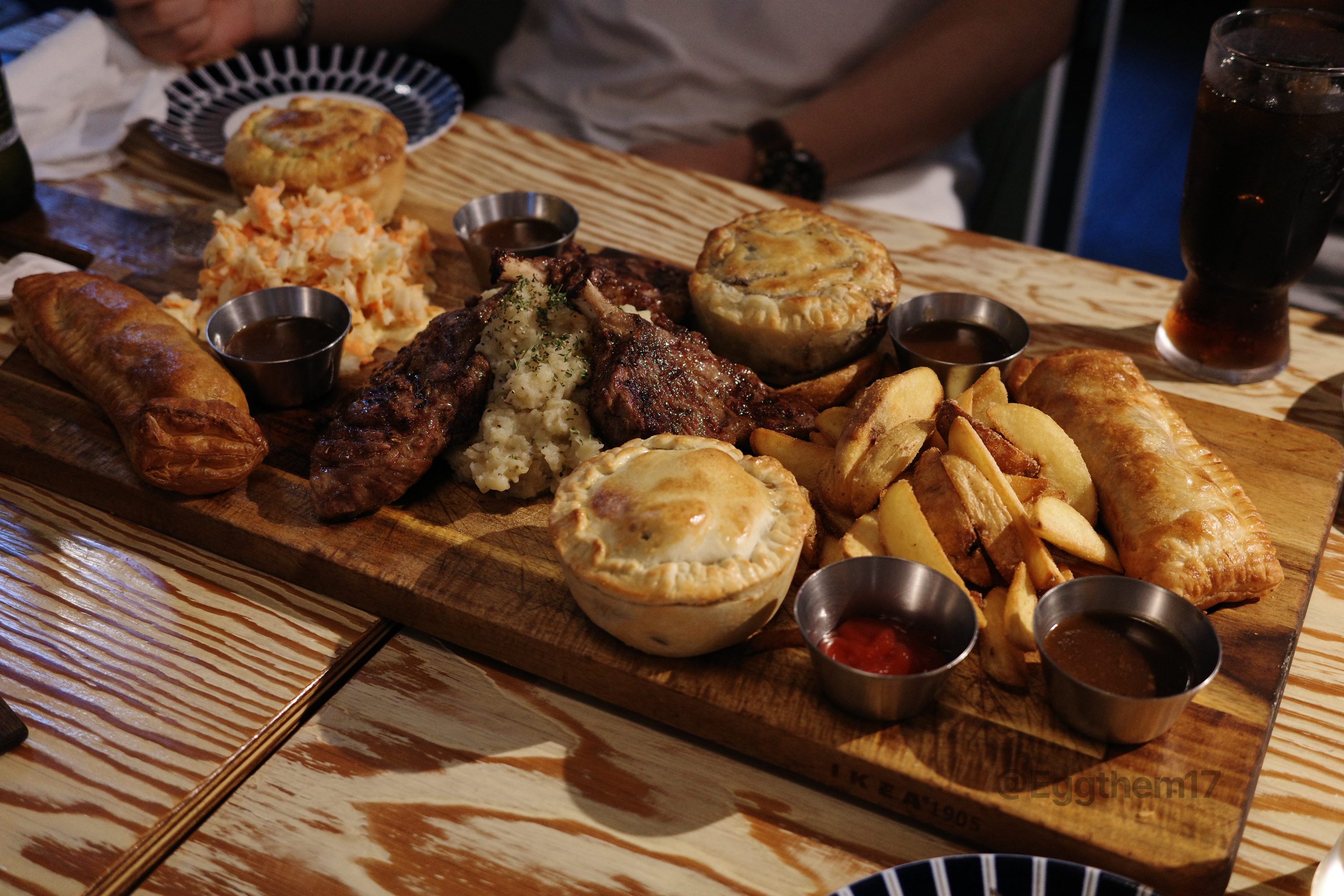 주문한 건 Ridiculous : Lamb pie, Pepper steak pie, Bobotie pie, Traditional, Chorizo, Slaw, Fires, Mesh Potatoes