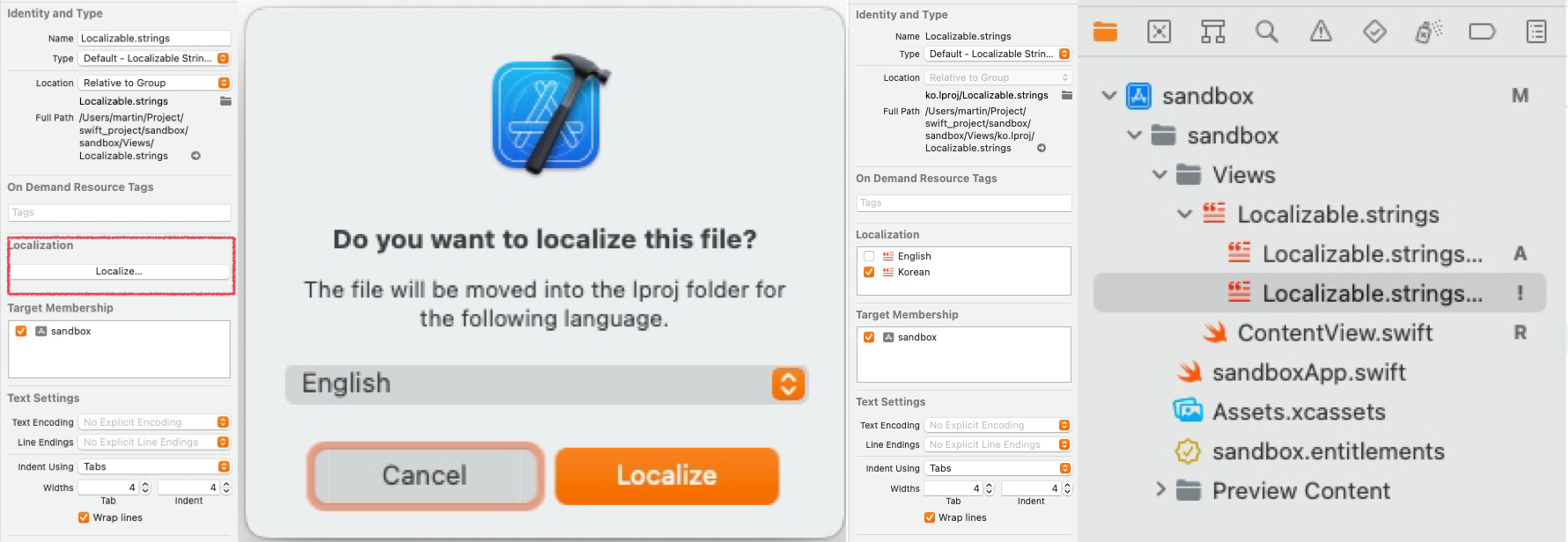앞서 생성한 Localizable.strings 파일을 선택한 뒤 File Inspector에서 'Localize...' 버튼을 누른다.