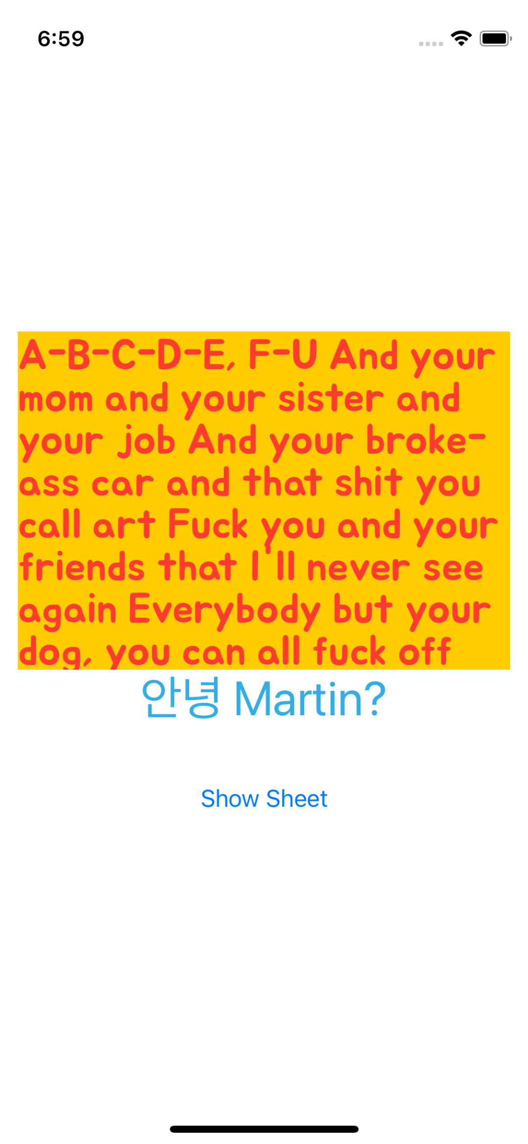 @State private var statusMessage = "A-B-C-D-E, F-U And your mom and your sister and your job And your broke-ass car and that shit you call art Fuck you and your friends that I'll never see again Everybody but your dog, you can all fuck off"