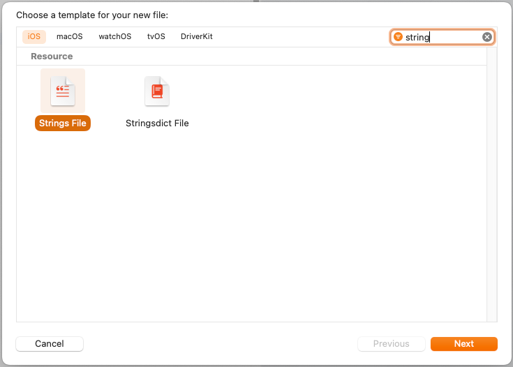 프로젝트 내에 'Strings File'을 생성하고, 이름을 Localizable로 변경한다.
