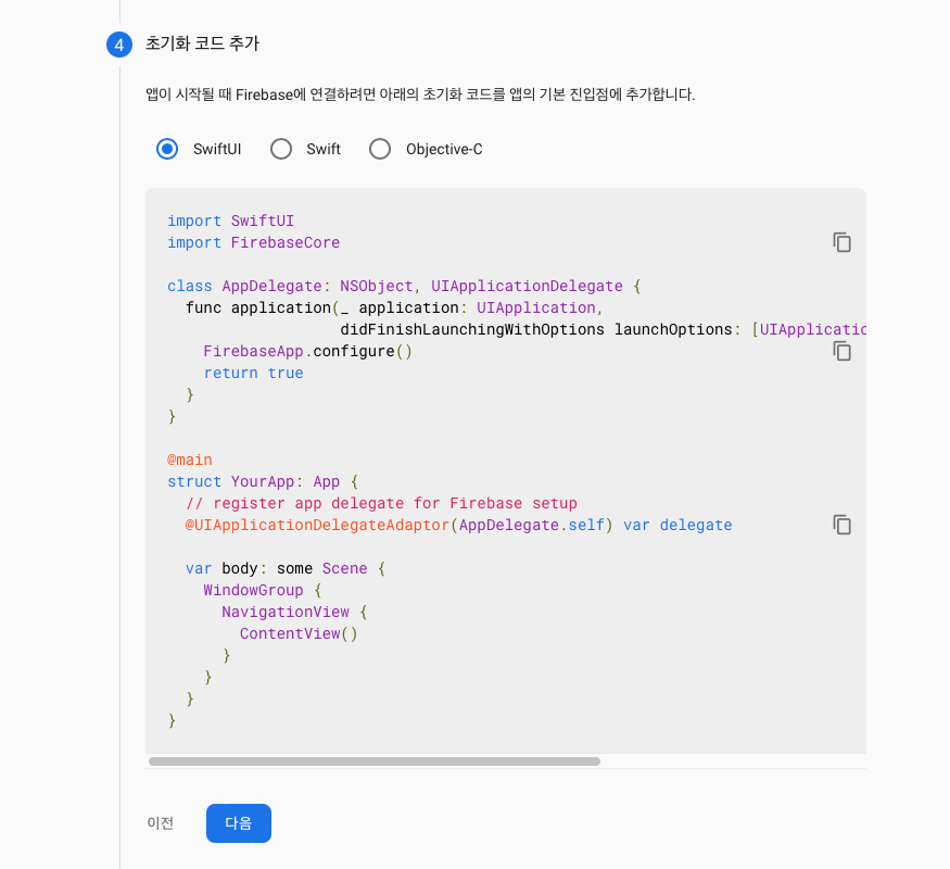 Firebase 쪽은 AppDelegate를 사용하는 방식을 안내하고 있지만,