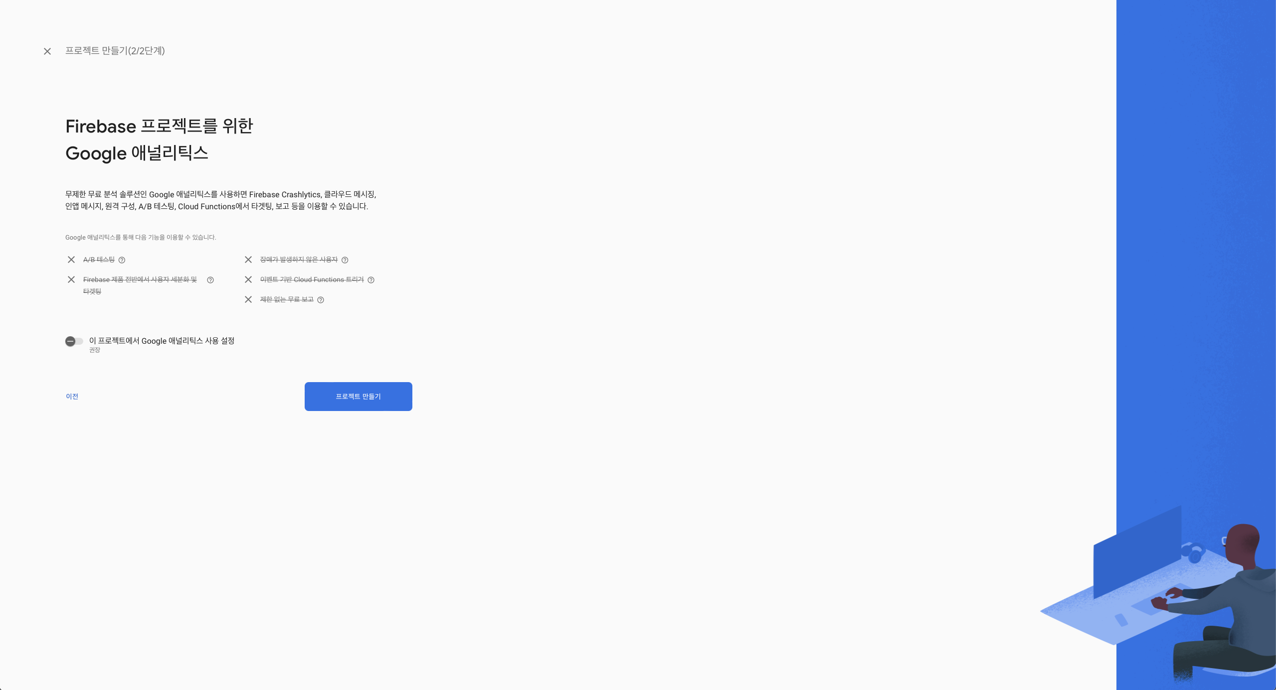 프로젝트를 생성하고, 이름을 지정한 뒤 지금은 필요 없는 Google Analystic은 비활성화한다.