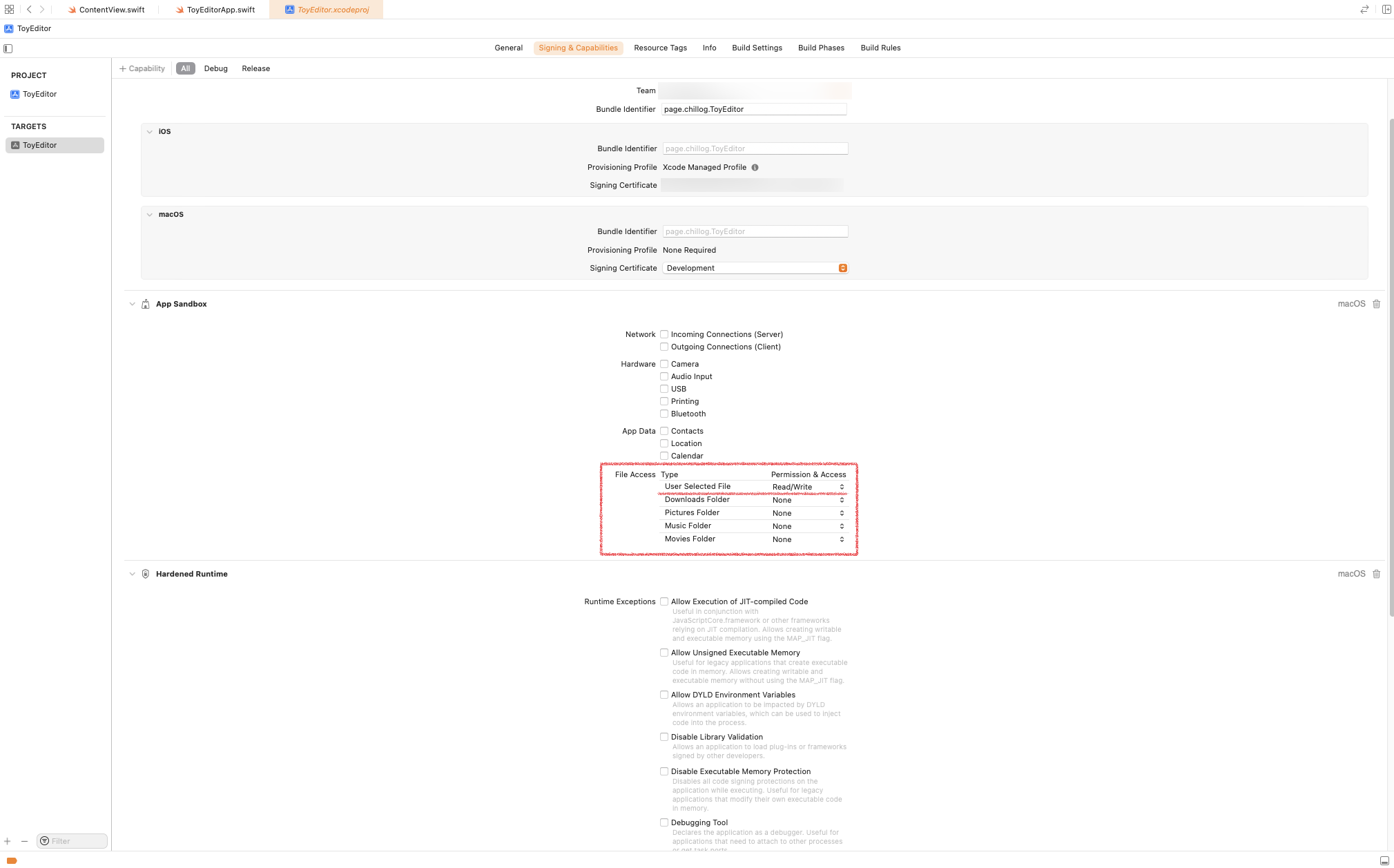 프로젝트의 Target으로 이동해 'App Sandbox' 부분의 User Selected File의 권한을 'Read/Write'로 변경한다.