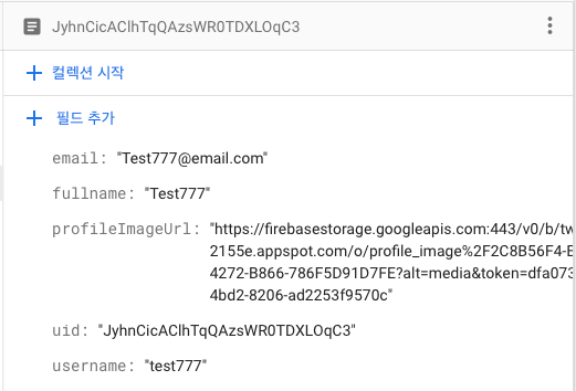 새로 가입한 Test777의 uid와 동일한 데이터가 추가됐고, imageUrl 프로필 사진의 ImageUrl도 잘 저장된 걸 확인할 수 있다.