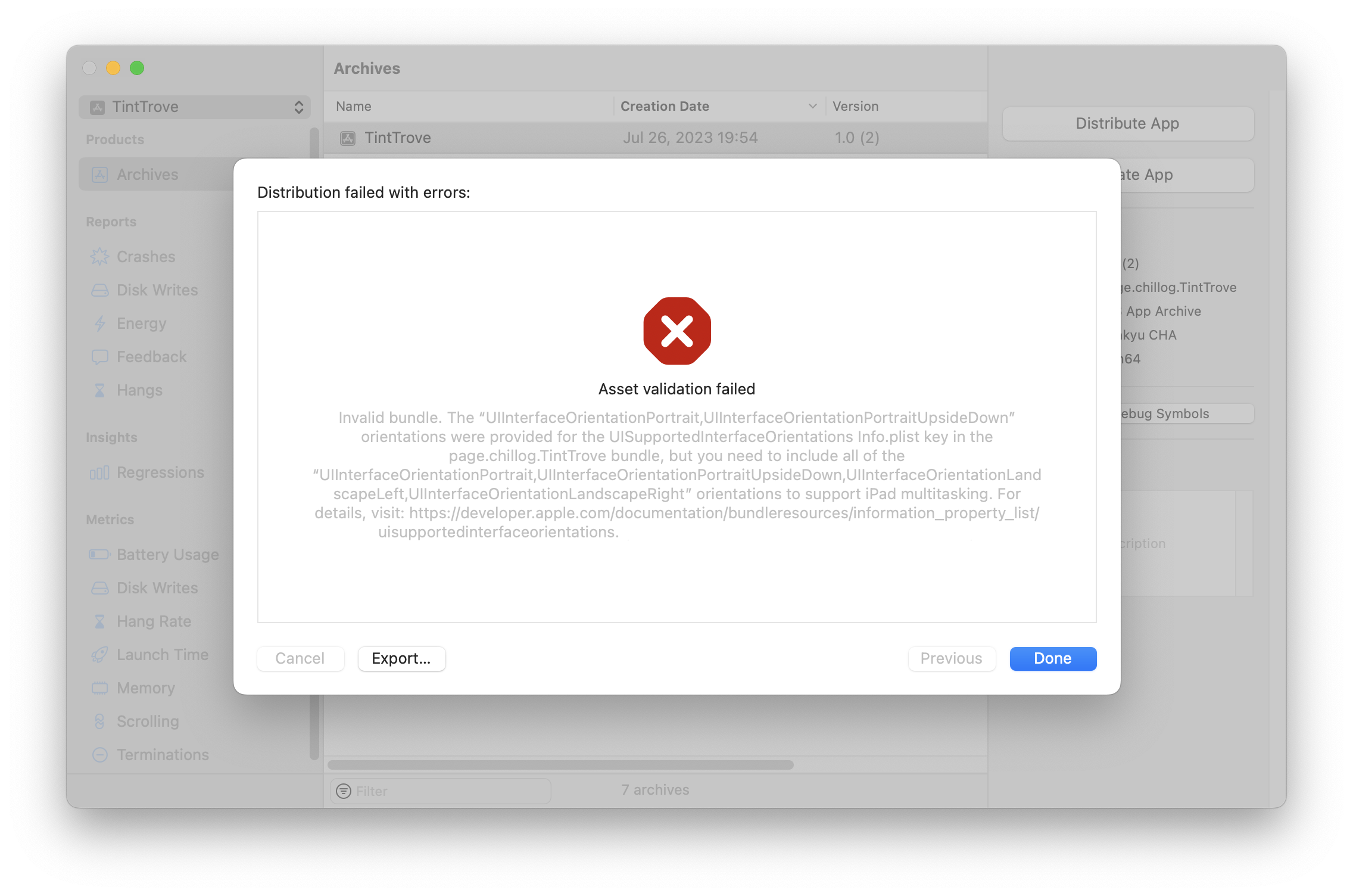 Requiers full screen 옵션을 함께 체크하고 Archive를 진행하면 해당 에러는 사라진다.
