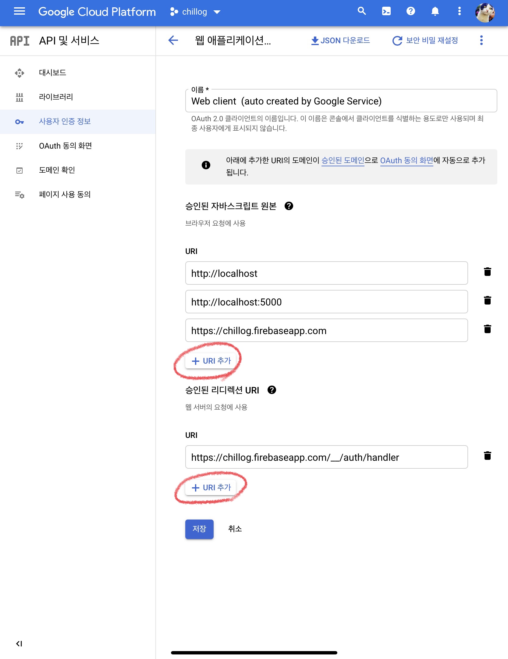 그러면 이렇게 URI를 추가 할 수 있는 곳이 있는데 ‘승인된 자바스크립트 원본’과 ‘승인된 리디렉션 URI’ 에 추가해 주면 된다.