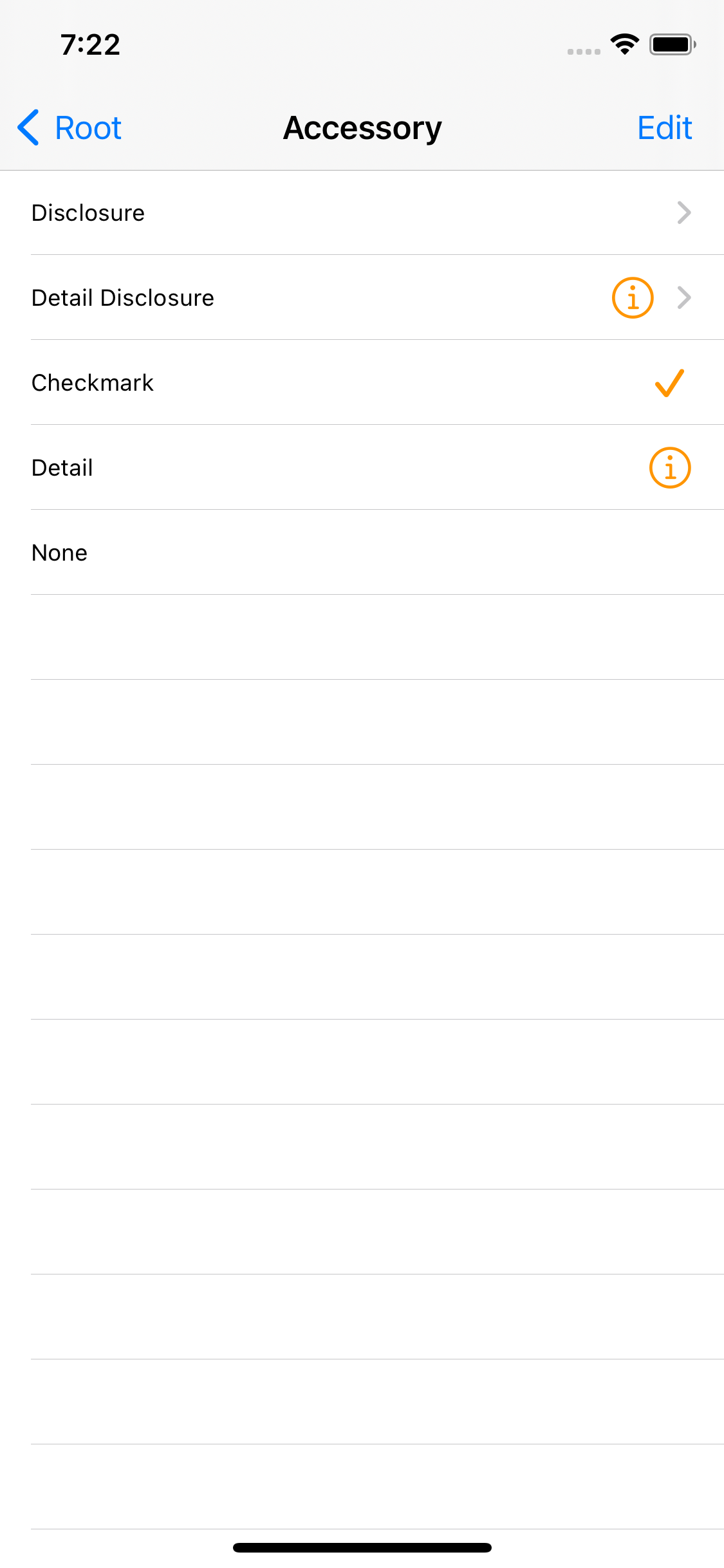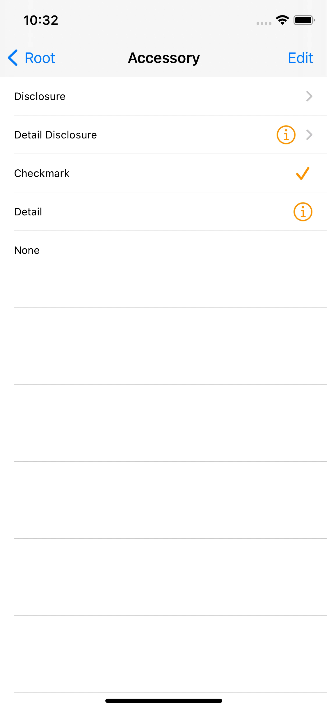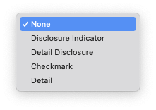 Editing Acc. 옵션으로 위와 같은 항목을 제공하지만 여기서 설정한 AccessoryView는 편집 모드에서 표시된다.