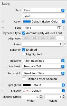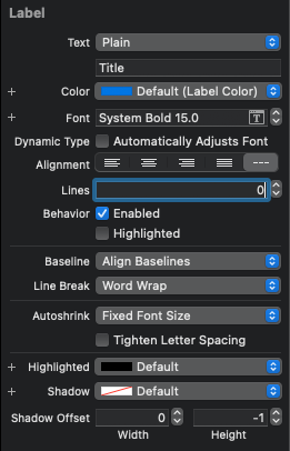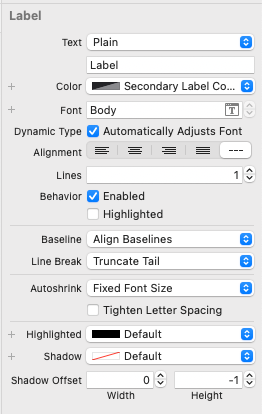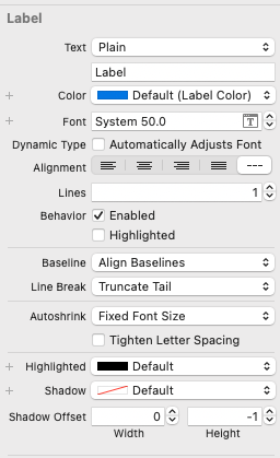 네 번째 Label의 Color는 Default, Font는 50으로 고정한다. Dynamic Type 옵션은 활성화하지 않는다.