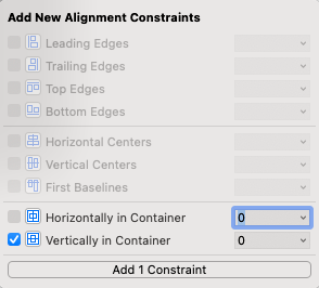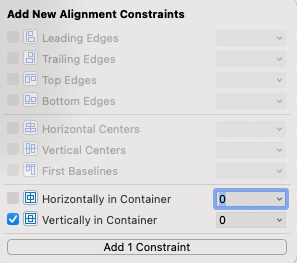 trailing 제약을 0으로 설정하고, 정렬 제약도 수직 중앙으로 설정한다.