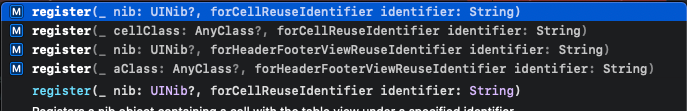 reusableCell을 등록하는 register 메소드는 두 가지로, 셀과 nib을 사용하는 차이가 있다.