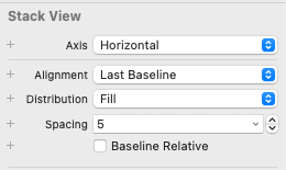세 번째, 네 번째 Label을 스택으로 묶고, 정렬을 Last BaseLine으로, 뷰 사이의 간격을 5로 설정한다.