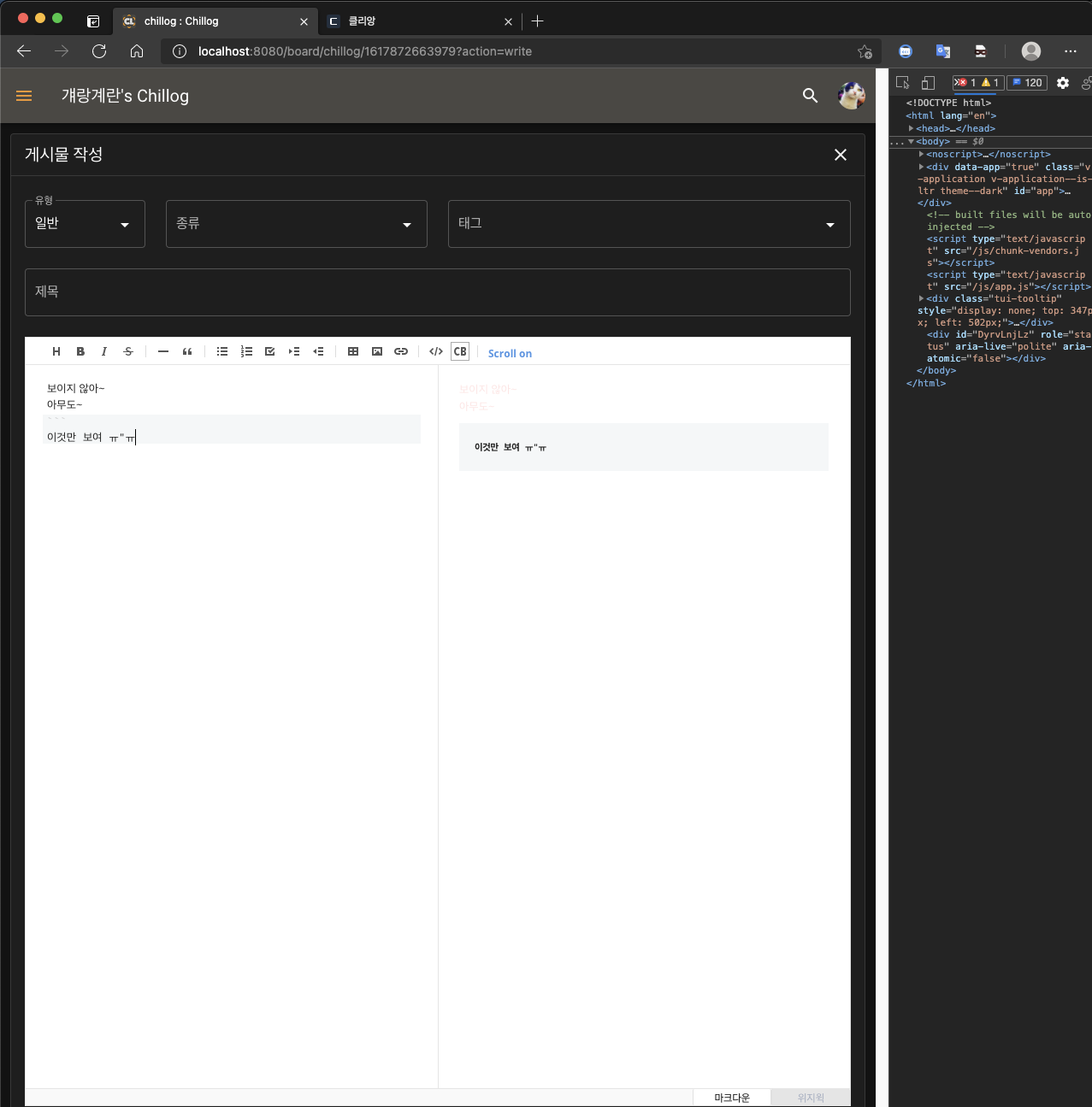위의 사진들에서 보이듯 마크다운 에디터의 뷰어에선 다크모드 관련 코드가 적용 되지 않는다.