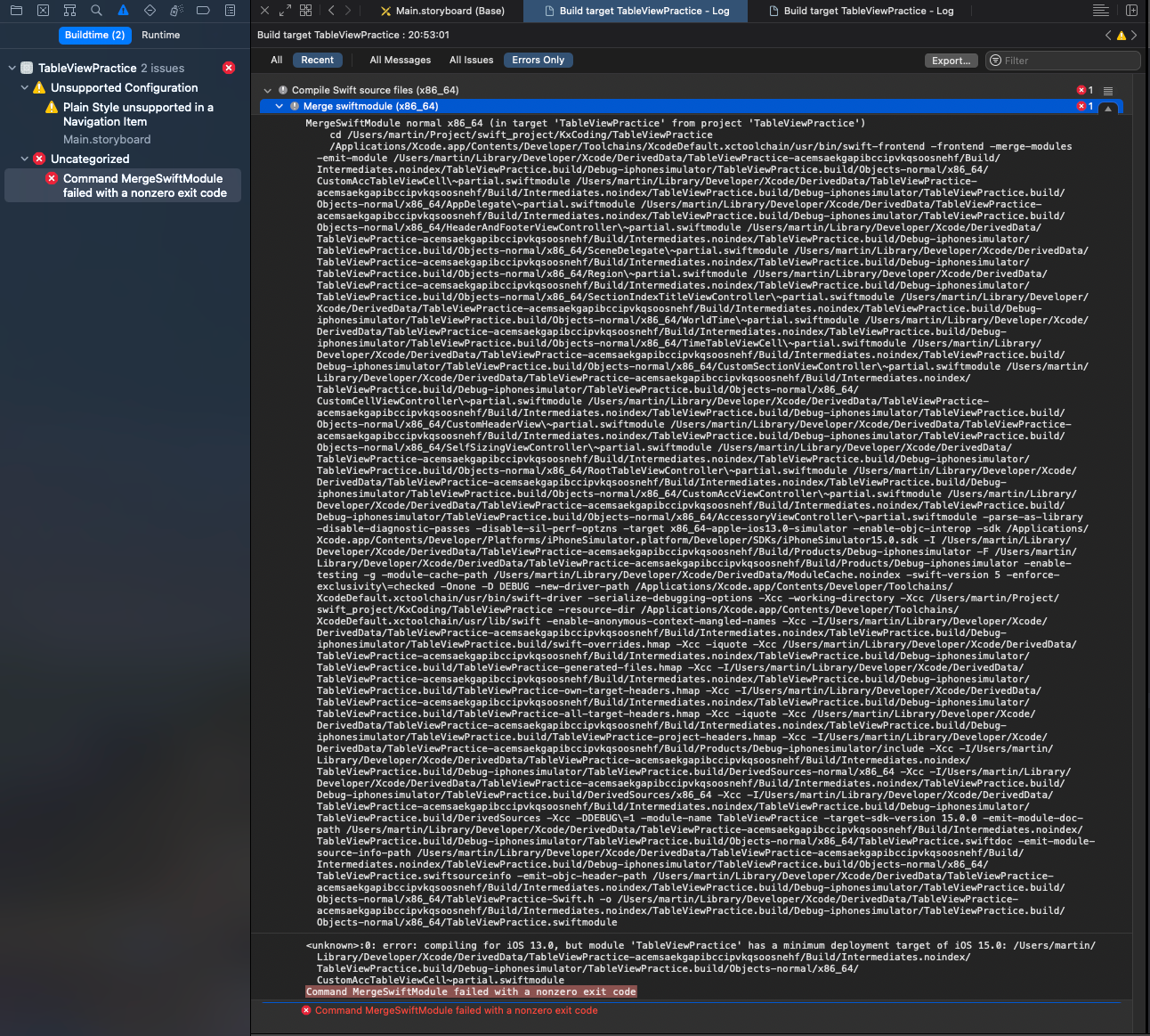 위와 같이 Command MergeSwiftModule failed with a nonzeror exit code.라는 난생처음 보는 오류가 발생한다. - Build Target을 iOS15.0으로 설정하는 경우