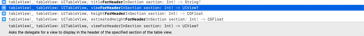 이제 UITableViewDelegate 프로토콜에서 커스텀 Header를 반환하는 메소드를 구현하면 된다.