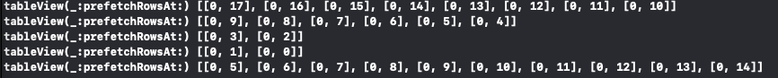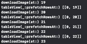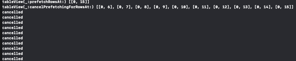 이후 빠르게 스크롤 해 콘솔을 확인해 보면 tableView(cancelPrefetchingForRowsAt:)메소드가 호출됐다.