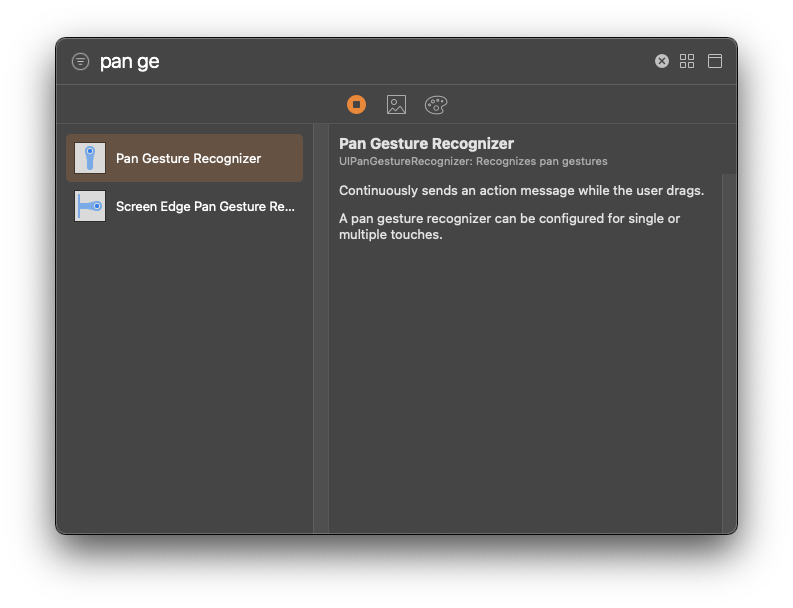라이브러리에서 Pan Gesture Recognizer를 찾아 씬 독에 추가한다.