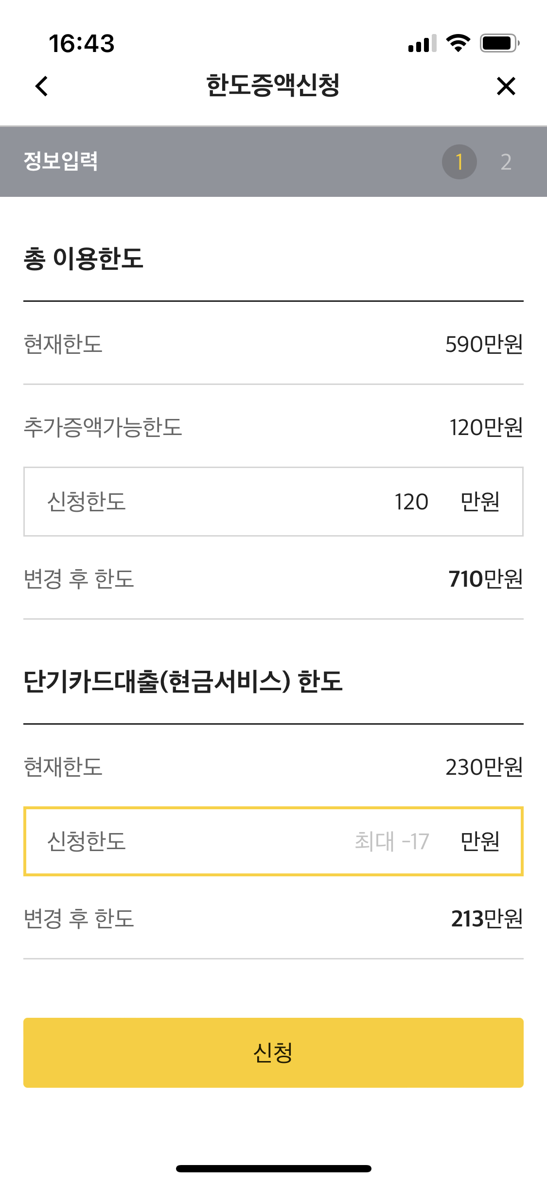 단기 카드대출한도의 Placeholder가 이에 맞지 않는 '-17'만원으로 표시되어있다.